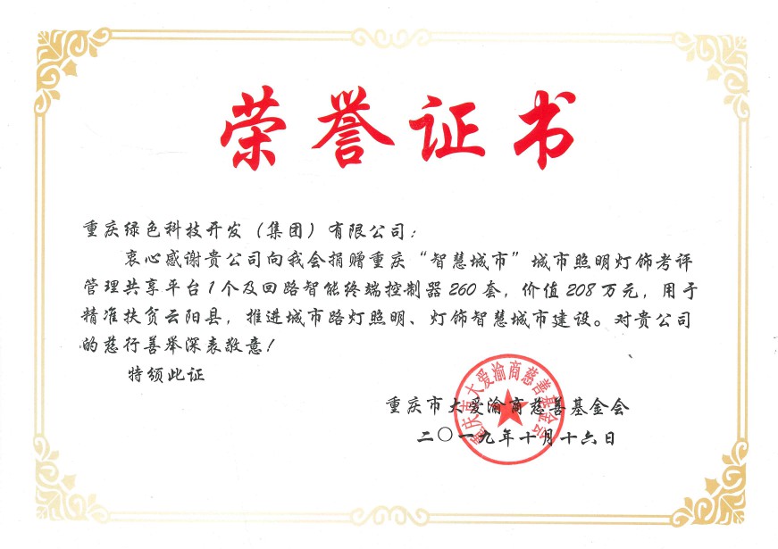 10月16日,重慶綠色科技開發(fā)(集團(tuán))有限公司為支持國(guó)家級(jí)重點(diǎn)貧困縣精準(zhǔn)扶貧工作,積極推進(jìn)智慧城市建設(shè),通過重慶市大愛渝商慈善基金會(huì),向云陽(yáng)縣市政設(shè)施管理所捐建了回路智能終端控制器260套,以及配套建設(shè)重慶“智慧城市”城市照明燈飾四級(jí)考評(píng)管理共享平臺(tái)1個(gè),總價(jià)208萬(wàn)元,用于解決云陽(yáng)縣城市路燈照明智能化管理的問題,幫助云陽(yáng)縣實(shí)現(xiàn)市政府在《重慶市城市綜合管理提升行動(dòng)方案》提出的城市照明“一把閘刀”管理的要求。
