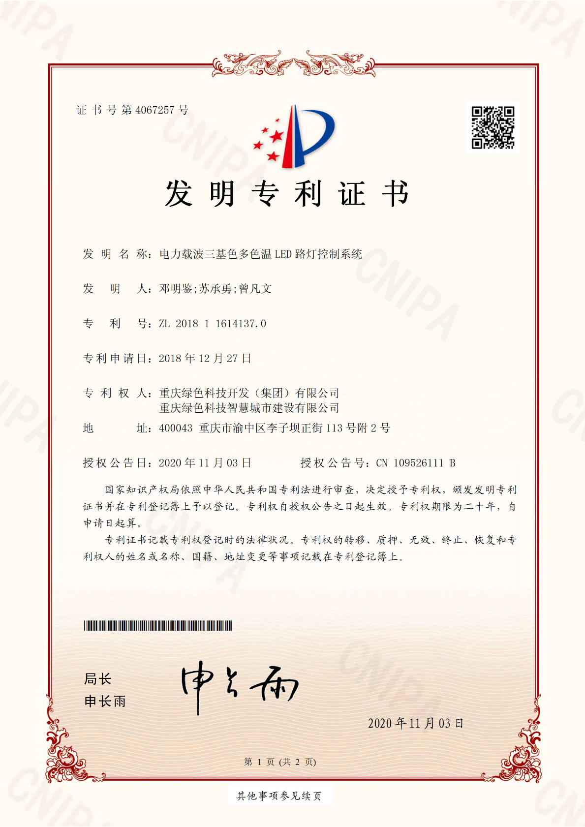 近日,重慶綠色科技開(kāi)發(fā)(集團(tuán))有限公司再度喜獲一項(xiàng)國(guó)家發(fā)明專(zhuān)利《電力載波三基色多色溫LED路燈控制系統(tǒng)》(專(zhuān)利號(hào):ZL 2018 1 1614137.0)。