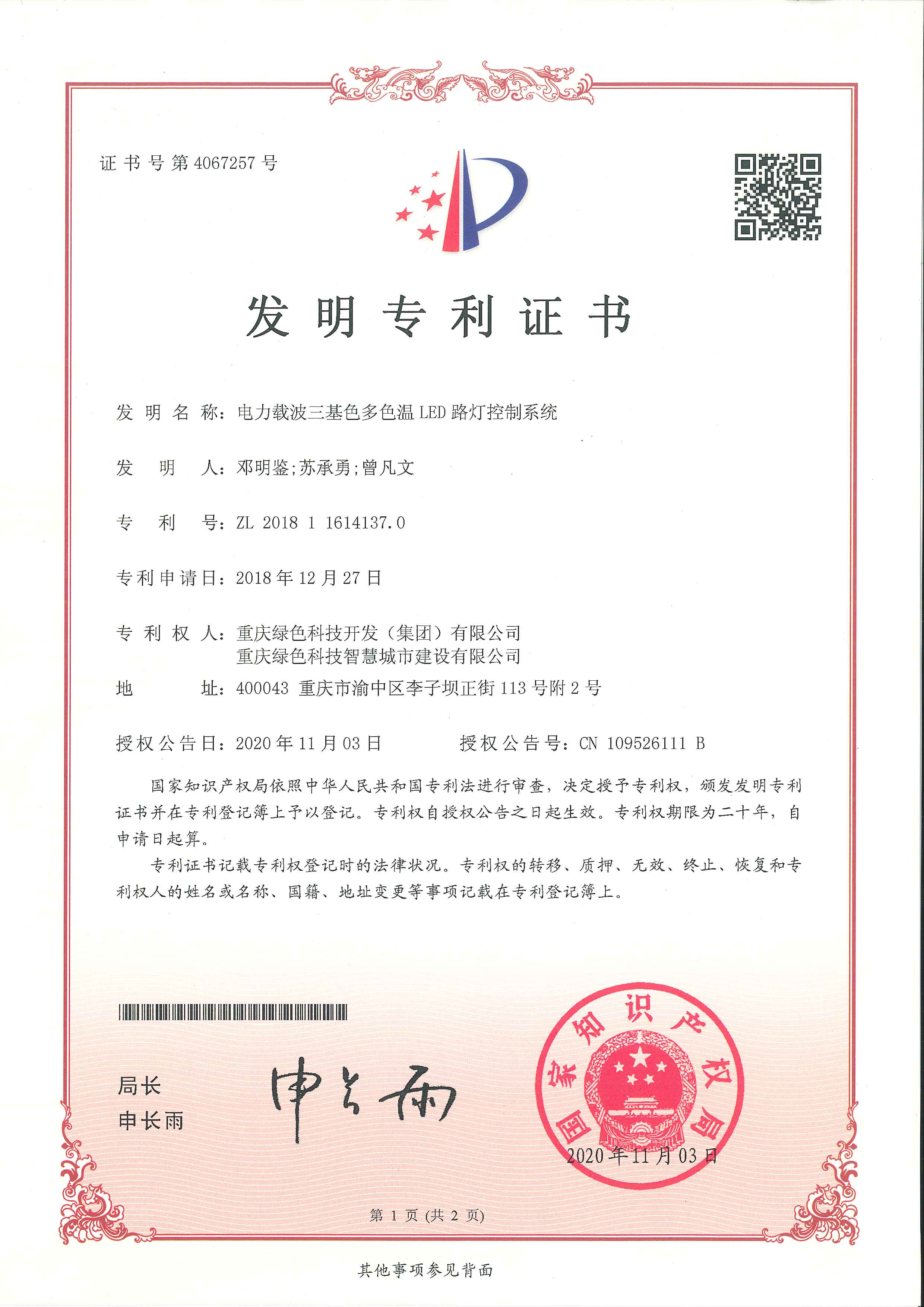 《電力載波三基色多色溫LED路燈控制系統(tǒng)》(專利號:ZL 2018 1 1614137.0)